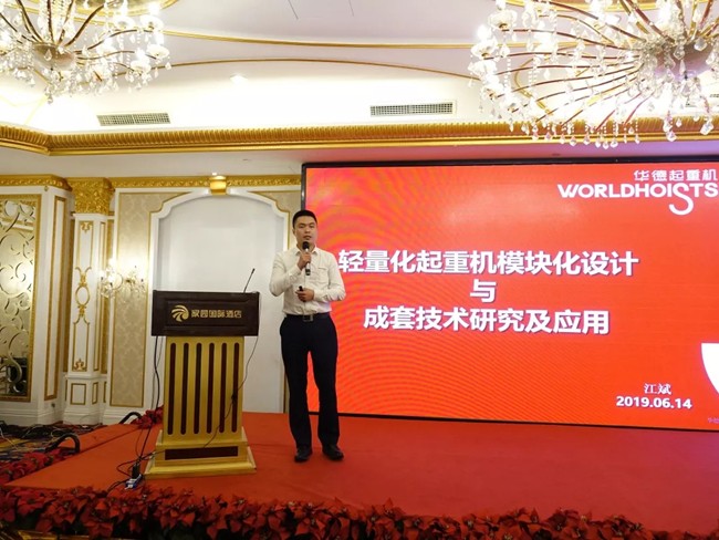 华德起重机(天津)股份有限公司销售总监江斌做《轻量化起重机模块化设计与成套技术研究与应用》的报告